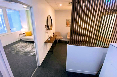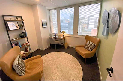 Rooms to rent on Wickham Terrace, Silverton Place (Level 9) - this area is well known as the precinct for medical and psychotherapy services. Newly renovated Suite that has been professionally soundproofed and thoughtfully furnished. Both rooms have large windows and views over Spring Hill. Includes a private and spacious kitchenette and waiting area; HICAPS; printer/scanner. On-site parking negotiable, depending on days leased.