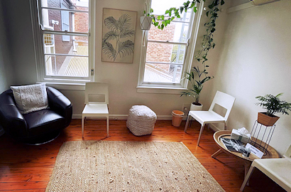 Beautiful, intentionally designed therapy space on King Street. An inviting sanctuary in the heart of Newtown. Wooden floors and solid furniture, with art, décor, and many lush plants to give a thoughtful and welcoming vibe. A stylish, comfortable lounge and two armchairs, suit up to three clients. There is lots of natural light plus a reverse cycle air conditioner. The room includes a desk and comfortable leather chair for telehealth and admin. The space is offered with complimentary tea facilities and access to tap water within the room. There are bathrooms within the building and a waiting area only a few metres from the door. Currently available all days of the week: $110/day.